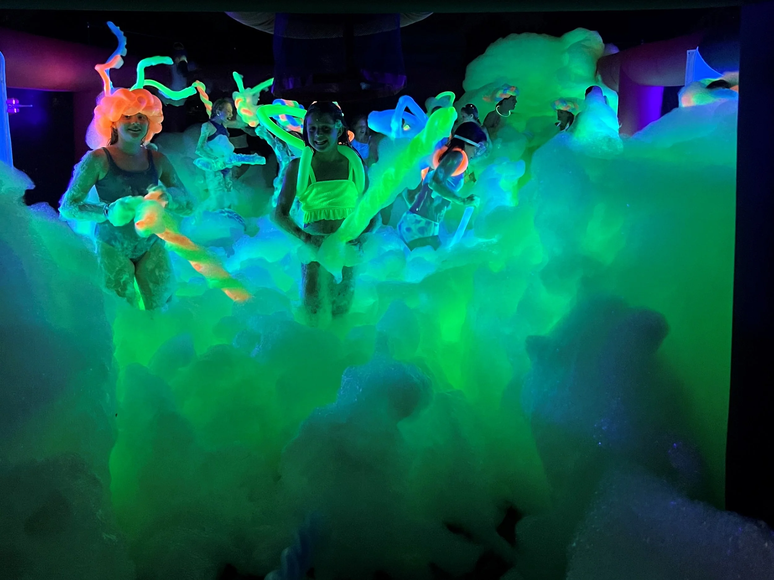 Take it to the next level with our UV Reactive Foam Party, featuring glowing foam, black lights, and night-time fun! Watch the bubbles light up the night as you and your guests dance, splash, and soak up the energy.
